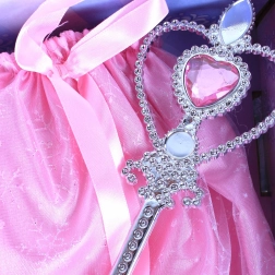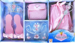 Ekskluzivni ružičasti komplet za male princeze koji će dovršiti svaku masku do savršenstva. Sadrži suknjicu, cipelice, krunu, žezlo, naušnice, prsten, ogrlicu i torbicu – sve lijepo usklađeno i ukrašeno ružičastim kamenčićima za maksimalan efekt. Idealan za karneval, proslave i igru kod kuće. Obogati svoj kostim prekrasnim dodacima u jedinstvenom stilu i uživaj u sjajnom princezom izgledu.