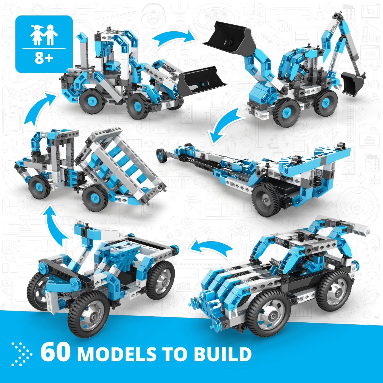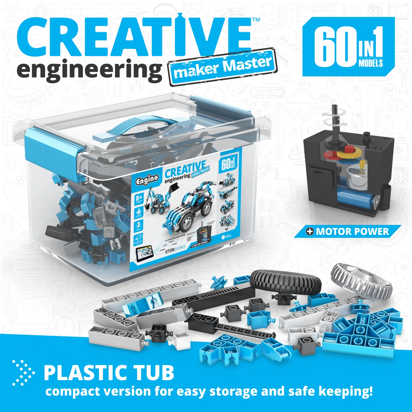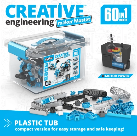 Konstrukcijski set ENGINO Motorized Maker 60 u 1 idealan je izbor za djecu od 8 godina naviše koja vole tehniku i stvaralaštvo. Šarene upute (dio tiskane, dio online ili u besplatnoj 3D aplikaciji) vode vas kroz izradu desetaka modela. Dijelovi se lako zakvačuju, a cijeli je set smješten u praktičnom plastičnom koferčiću za jednostavno prenošenje i pohranu.