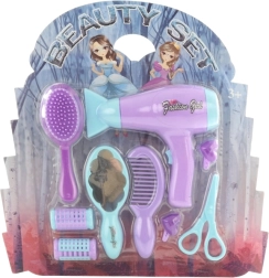 Zabavan frizerski set za male stiliste od 3 godine sadrži baterijski fen veličine cca 16 × 15 cm, češalj, četku, 2 uvijača, 2 ukosnice i škare. Sve je izrađeno od izdržljive plastike i prilagođeno sigurnoj dječjoj igri. Fen radi na 2 AA baterije.