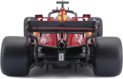 Model prikazuje realistične vizualne elemente uključujući sponzorske logotipe i aerodinamične oblike tipične za trkaće bolide Ferrarija.