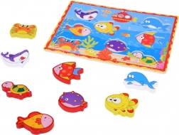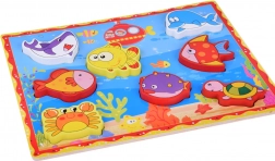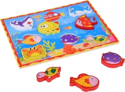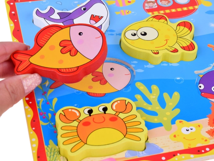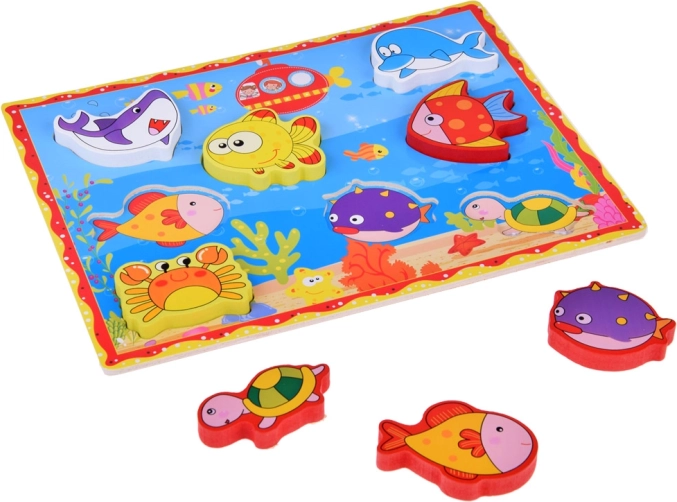Otkrijte razigranu drvenu slagalicu s umetanjem s morskim motivom koja potiče dječju maštu i vještine. Zahvaljujući velikim dijelovima i živim bojama djeca vježbaju finu motoriku, logičko razmišljanje, prepoznavanje oblika te uče nazive morskih životinja. Sigurna izrada i kvalitetna obrada mame na igru iznova i iznova.