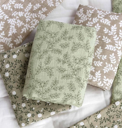 Ova pahuljasta muselinska ručnik/ponjava s uzorkom leaves u nijansi sage stvorena je za osjetljivu dječju kožu. Prirodna vlaknasta struktura muselina osigurava odličnu cirkulaciju zraka, brzo sušenje i ugodan dodir tijekom cijelog dana.