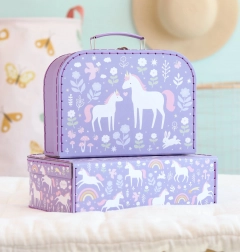 Set dvaju dekorativnih kufrića brenda A Little Lovely Company donosi razigran dizajn s jednorozima, dugom i cvijećem na ljubičastoj podlozi. Laka, a ipak čvrsta konstrukcija od izdržljivog kartona s kvalitetnim prošivom osigurava dug vijek trajanja i udobno prenošenje.