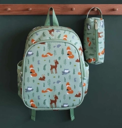 Prostran mint zeleni ruksak s motivom šumskih životinja idealan je za vrtić i izlete. Nudi veliki glavni pretinac, izolirani prednji džep za užinu, bočne džepove za bocu te podstavljene naramenice s prsnom trakom za udobno i sigurno nošenje.