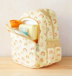 Stilizan dječji ruksak s motivom duge idealan je za vrtić i izlete. Nudi prostranu glavnu komoru, izolirani prednji džep za užinu i dva bočna džepa za bocu. Za udobno nošenje ima podstavljene naramenice, prsni remen protiv klizanja i prozračnu podstavljenu stražnju ploču.