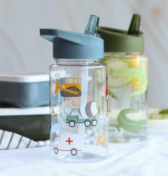 Prozirna dječja boca za piće s motivom vozila i praktičnom preklopnom slamkom osigurava udobno pijenje bez prolijevanja. Izdržljiv materijal Tritan je lagan, siguran i idealan za vrtić, školu i izlete. Napravite kompletan set u istom dizajnu – boca, ruksak i kutija za užinu.