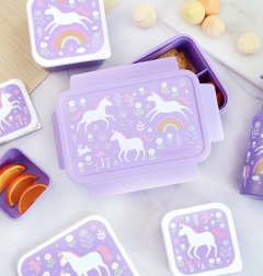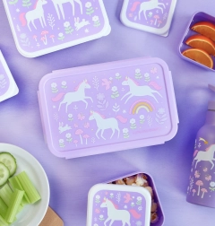 Presladak lunch box brenda A Little Lovely Company razveselit će djecu razigranim dizajnom s jednorozima i dugom, a roditelje promišljenom izradom. Zahvaljujući čvrsto brtvećem poklopcu sadržaj ostaje svjež i sigurno zatvoren. Izvadivi pladanj s dvjema pregradama omogućuje preglednu podjelu voća, povrća, peciva ili slatkiša.