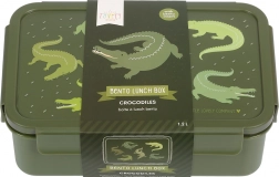 Praktična kutija za užinu s printom krokodila idealna je za školu i izlete. Ima zrakonepropusni poklopac na kvačice i izvadivu posudicu s dvjema pregradama, pa će užine ostati svježe i pregledno organizirane cijeli dan.