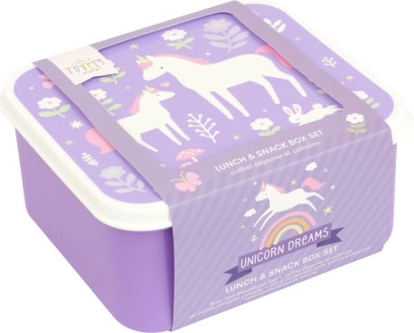 Praktičan set od četiri kutije za užinu u četiri veličine s motivom jednoroga i duge. Kutije se lako otvaraju, mogu se slagati jedna u drugu radi uštede prostora i idealne su za ručak, užinu i sitnice za vrtić ili izlete.
