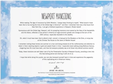 „Vile u Newportu“ donose ljepotu i eleganciju arhitektonskih znamenitosti u vašu dnevnu sobu. Ova slagalica Michaela Storringse inspirirana je slavnim vilama u Rhode Islandu i nudi jedinstven pogled na povijesnu i kulturnu važnost. Visokokvalitetna izrada i precizno izrezani dijelovi jamče nezaboravno iskustvo slaganja.