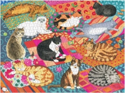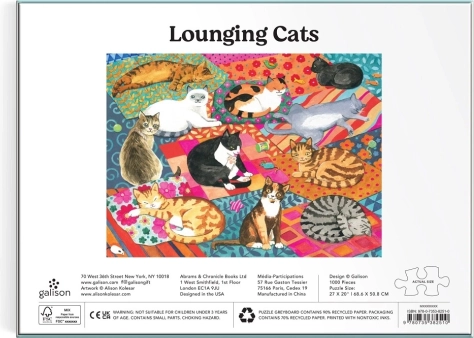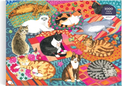 Uživajte u opuštanju s prekrasnim slagalicama GALISON s motivom ilustratorice Alison Kolesar. Slagalica od 1000 dijelova prikazuje preslatke mačke na šarenim pokrivačima i jastucima, izrađena od recikliranih materijala, s mat završnom obradom, netoksičnim tintama i vrhunskim tiskom za živopisne boje i detalje.