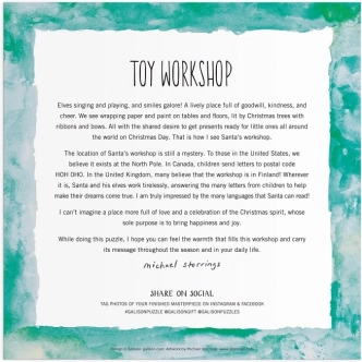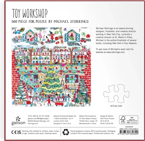Uživajte u blagdanskom ugođaju s dizajnerskim puzzlama s folija efektom autora Michaela Storringsa. Ove puzzle od 500 dijelova, odgovorno proizvedene od FSC papira, nude metalno sjajnu površinu, detaljnu ilustraciju božićne radionice i precizno izrezane dijelove za glatko slaganje. Idealne kao božićni poklon, opuštanje za cijelu obitelj i elegantna dekoracija nakon slaganja.