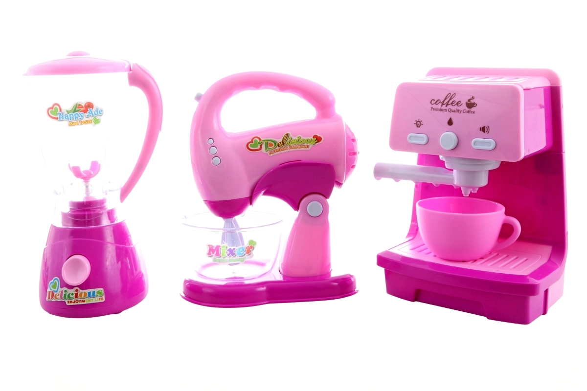 Dio seta su aparat za kavu sa šalicem, stolni mikser s prozirnom posudom i ručni mikser s posudom. Svaki uređaj se napaja s 2× AA baterije (nisu uključene u pakiranje). Cijeli set je pakiran u poklon-kutiji dimenzija cca 43 × 22 × 10 cm.