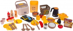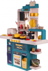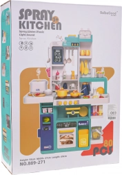 Dio seta su i otvarajući hladnjak i pećnica, praktične police za odlaganje namirnica i posuđa, ploča za kredu za popise za kupnju ili recepte te glazbeni panel s melodijama i zvukovima kuhinjske nape. Parni lonac za rižu dodatno ispušta paru i autentične zvukove. Cijeli set čini 80 dijelova pribora za duge sate zabave.