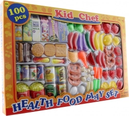Veliki set hrane. Pakiranje sadrži ukupno 100 dijelova (voće, povrće, pekarski proizvodi, slatkiši, konzerve i kartonska pića). Dimenzije pakiranja cca 58×39×5 cm. Dob 3+