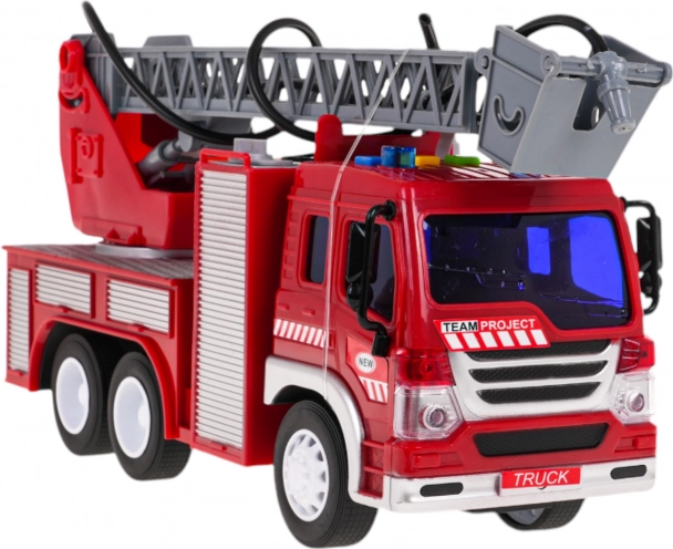 Vrsta vozila: "Mrežno upravljanje". . | Interaktivno vatrogasno vozilo sa zvučnim i svjetlosnim efektima te prskanjem vode za djecu od 3 godine. Vatrogasno vozilo izrađeno je od najkvalitetnijih materijala u živim bojama. Ima pomične dijelove kao što je podesiva ljestva gore-dolje, a također se izvlači i skraćuje. Na kraju ljestvi nalazi se platforma s nastavkom vatrogasnog crijeva iz kojeg teče voda. Na početku prikolice smješten je spremnik za vodu. Kada se spremnik napuni vodom, dovoljno je pritisnuti gumb na gornjoj strani spremnika i voda počinje teći. Na krovu kabine vatrogasnog vozila nalaze se tipke čijim pritiskom se oglašava zvuk sirene, trube ili zvuk kretanja vozila. Zvukove prate bljeskajuća svjetla rotirke. Vozilo ima gumene gume i trenjni pogon na prednjoj osovini. Napaja se baterijama AG13 (uključene u pakiranje). .. Funkcije vozila: . - prikladno za djecu stariju od 3 godine, .- izrađeno od vrlo kvalitetnih materijala, .- mjerilo 1:16, .- pomični elementi: ljestve koje se izvlače, podižu i spuštaju te skraćuju, .- krak dizalice rotira se 360 stupnjeva, .- voda pršti iz vatrogasnog crijeva, .- trenjni pogon prednjih kotača, .- gumene gume, .- svjetlosni efekti: bljeskajuća svjetla na krovu vozila, .- zvučni efekti: signal sirene, truba ili zvuk kretanja vozila. . |