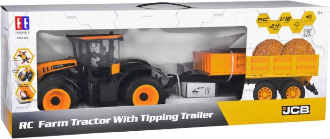 Traktor s prikolicom u upadljivoj boji s crnim detaljima vjerno oponaša pravi stroj. Cijela igračka izrađena je od visokokvalitetne, izdržljive plastike koja osigurava bezbrižnu i dugotrajnu upotrebu. Velika, široka kotača s tvrdim gumenim gumama odlično se snalaze na raznim podlogama. Model je precizno reproduciran, a dojam upotpunjuje kabina vozača opremljena brojnim detaljima. Zvučni i svjetlosni efekti vrlo su realistični i čine igru još zanimljivijom.