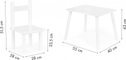 Stol: 55 × 40 × 43 cm. Stolica: visina 51,5 cm, širina 28 cm, visina sjedala 23,5 cm. Ergonomija za udobnost i pravilno sjedenje djece od 3 godine.
