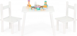 Stvorite djeci vlastiti kutak za igru i učenje. Bijeli drveni set ECOTOYS spaja jednostavan skandinavski dizajn s izdržljivom izradom: masivne borove noge osiguravaju stabilnost, a MDF ploča se lako održava čistom. Set sadrži stol i dvije udobne stoličice usklađenih proporcija.