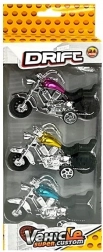 Ovaj set triju realističnih mini motocikala nudi puno zabave i mogućnost proširenja kolekcije. Zahvaljujući kombinaciji metalnih i plastičnih dijelova modeli su čvrsti, izdržljivi i oduševit će bogatim detaljima – od upravljača preko sjedala do „kromiranih“ elemenata. Zahvaljujući kompaktnim dimenzijama savršeno leže u dječjoj ruci.