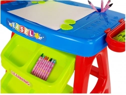 Stolić ima praktične ladice za bojice i pribor, zaobljene završetke bez oštrih rubova te se može prilagoditi – ruku projektora moguće je postaviti lijevo ili desno prema potrebi. Certificirani, sigurni materijali i stabilne noge osiguravaju dug vijek trajanja i ugodnu upotrebu za djecu predškolske dobi.