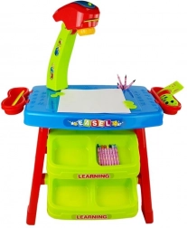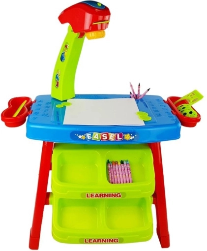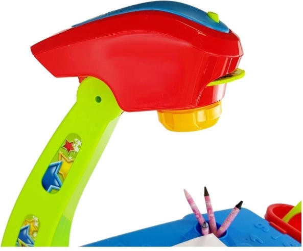 Ovaj šareni stolić s projektorom pretvara svako stvaranje u zabavnu i edukativnu avanturu. Dovoljno je umetnuti odabrani disk, uključiti projektor i na papiru formata A4 pojavit će se slika s konturama ili u boji – dijete je može lako precrtati i obojiti prema predlošku. Zahvaljujući šablonama oblika i slova dodatno će uvježbati prepoznavanje geometrijskih oblika i prvo pisanje slova.