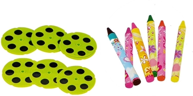U kompletu je 36 slikovnih šablona, 6 projekcijskih diskova, 12 šarenih kreda/pisala te šablone slova i geometrijskih oblika.