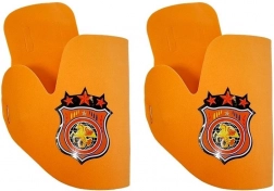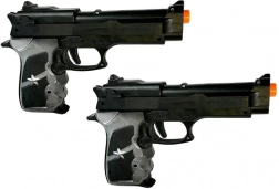Dva crna pištolja igračke s sivim ručkama i narančastim vrhovima za sigurnost, osiguravaju realističnu, ali sigurnu igru.