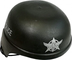 Crna kaciga s bijelim emblemom i natpisom 'POLICE' idealna je za zaštitu, izrađena od izdržljive plastike s podesivom trakom ispod brade.