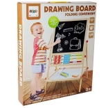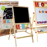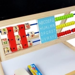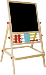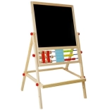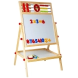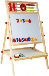 Ploča je neizostavna oprema; mala umjetnica će razvijati likovne vještine crtanjem kredama, a može također učiti pisati i računati. Opremljena je praktičnom policom za pribor. Robusno izrađena od materijala najviše kvalitete. Pažljivo obrađena, bez oštrih rubova. Za crtanje na crnoj strani ploče koristite krede – u pakiranju su tri boje. Ima abak s kuglicama u 3 boje, uz koji će dijete započeti avanturu brojanja, a s druge strane drvene kocke s brojevima pomoću kojih može lako izvoditi osnovne matematičke operacije. S brojevima i matematičkim znakovima na magnetima može naučiti osnovne operacije poput zbrajanja, oduzimanja i množenja. U srednjem dijelu nalaze se satovi na kojima dijete pomoću kazaljki podešava vrijeme i prepoznaje sate.