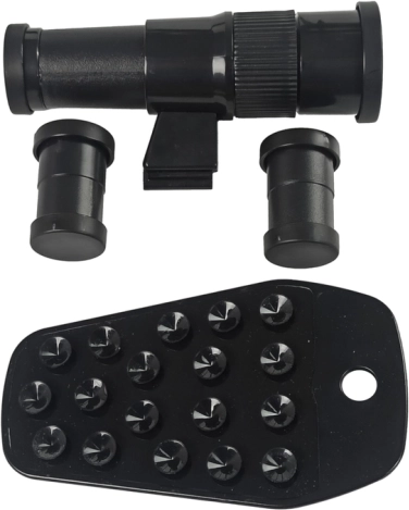 - teleskop, stativ, držač/prijanjalica za telefon, dijagonalni (prizmatični) prizm, 2 dodatna okulara, poklopac