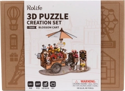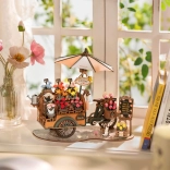 Otkrijte ljepotu ulične prodaje cvijeća s drvenim 3D puzzlama Cvjetna kolica Rolife. Ovaj model donosi čar drevnih tržnica u vaš dom. Kolica su opremljena rustikalnim kotačima, suncobranom i kanticom za zalijevanje. Gotov model postaje prekrasna dekoracija koja oživljava svaki interijer.