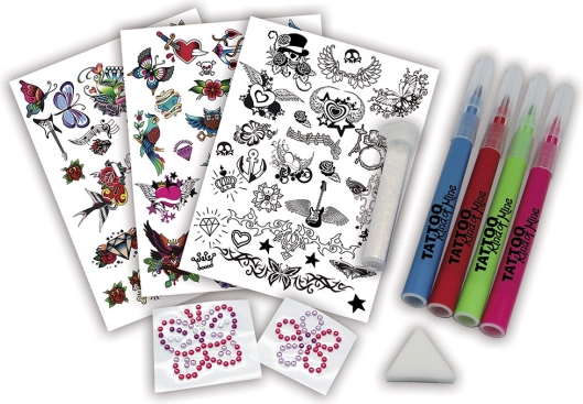 Izradite vlastite originalne tetovaže ili pokušajte ponovno stvoriti omiljene motive. Set je jednostavan za korištenje i zabavan za svaku prigodu.