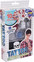 Izradi vlastite originalne dizajne s ovim setom za privremene šljokičaste tetovaže za dječake. Sadrži 4 višekratne šablone, 3 boje šljokica, ljepilo, kist i upute – jednostavna zabava za djecu od 6+.