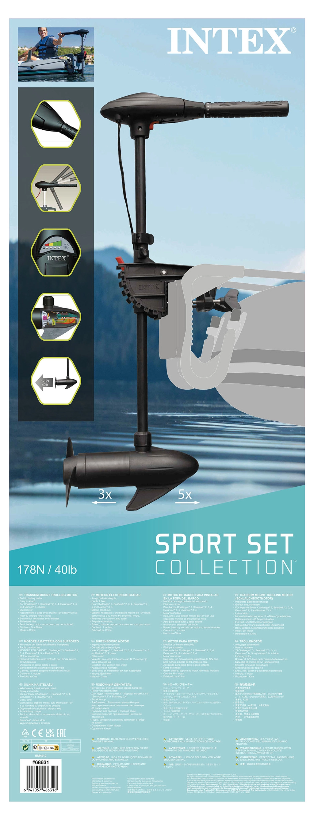 Pouzdan i tihi elektromotor 12 V za napuhavajuće čamce, idealan za modele Seahawk, Excursion, Seahawk II, Mariner i Challenger. Nudi jednostavno pričvršćivanje, snagu 420 W, rad i u slanoj vodi te ugrađeni mjerač baterije za kontrolu razine energije. Baterije nisu uključene u pakiranje.