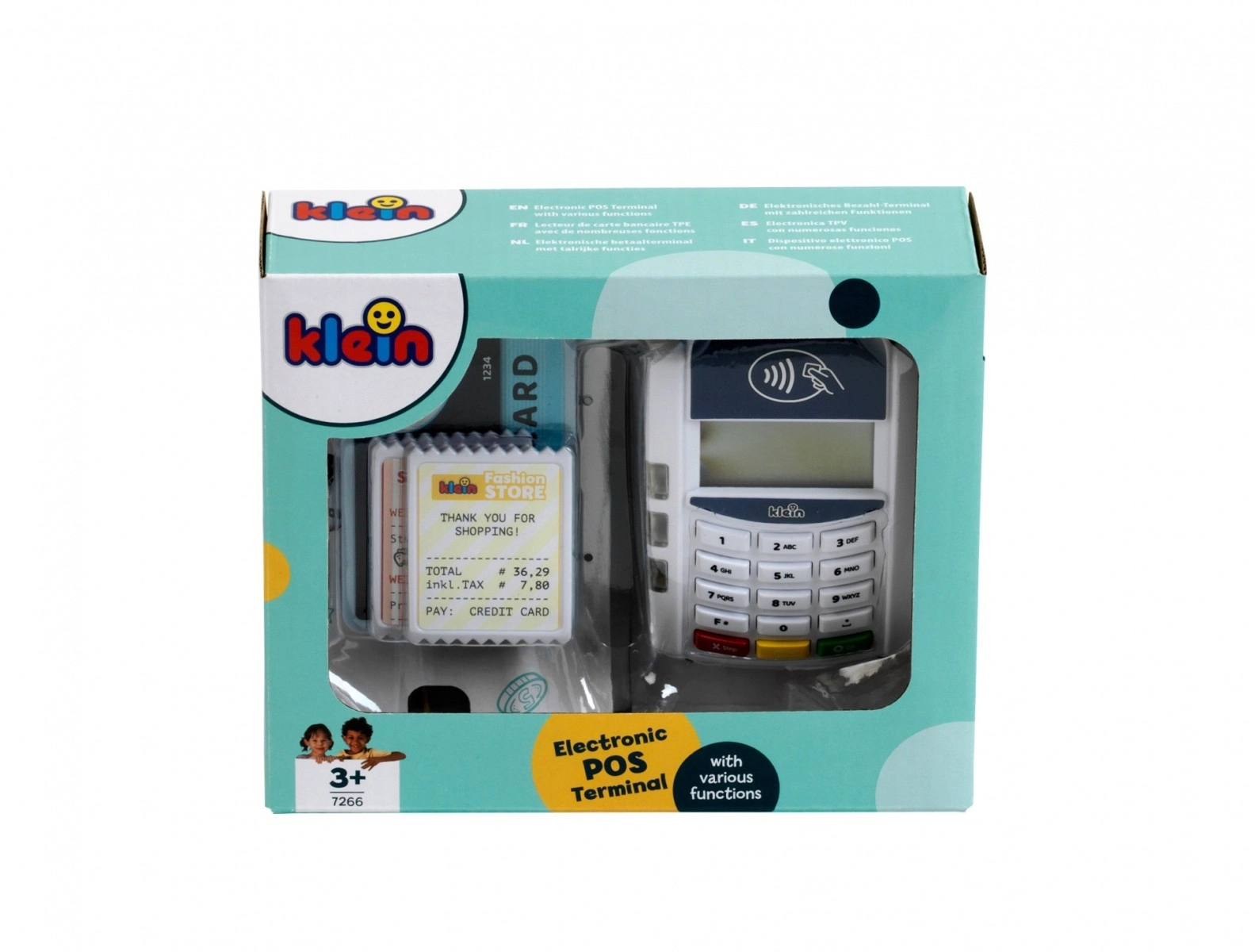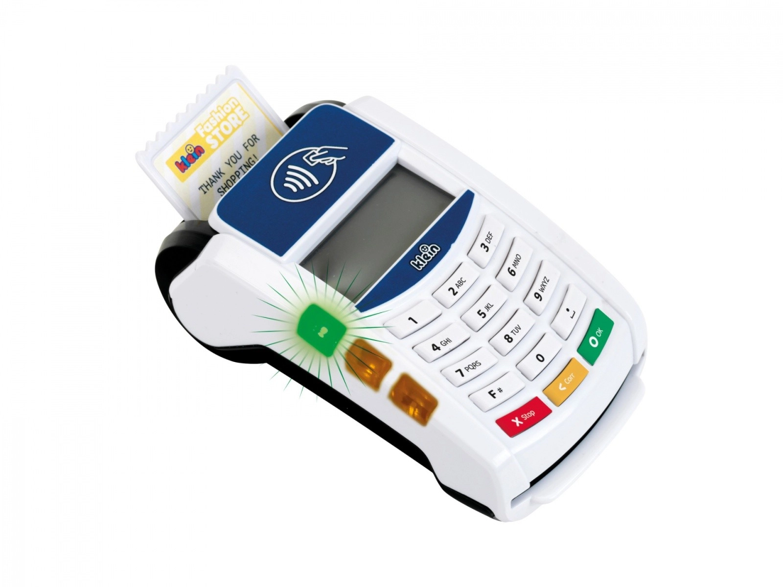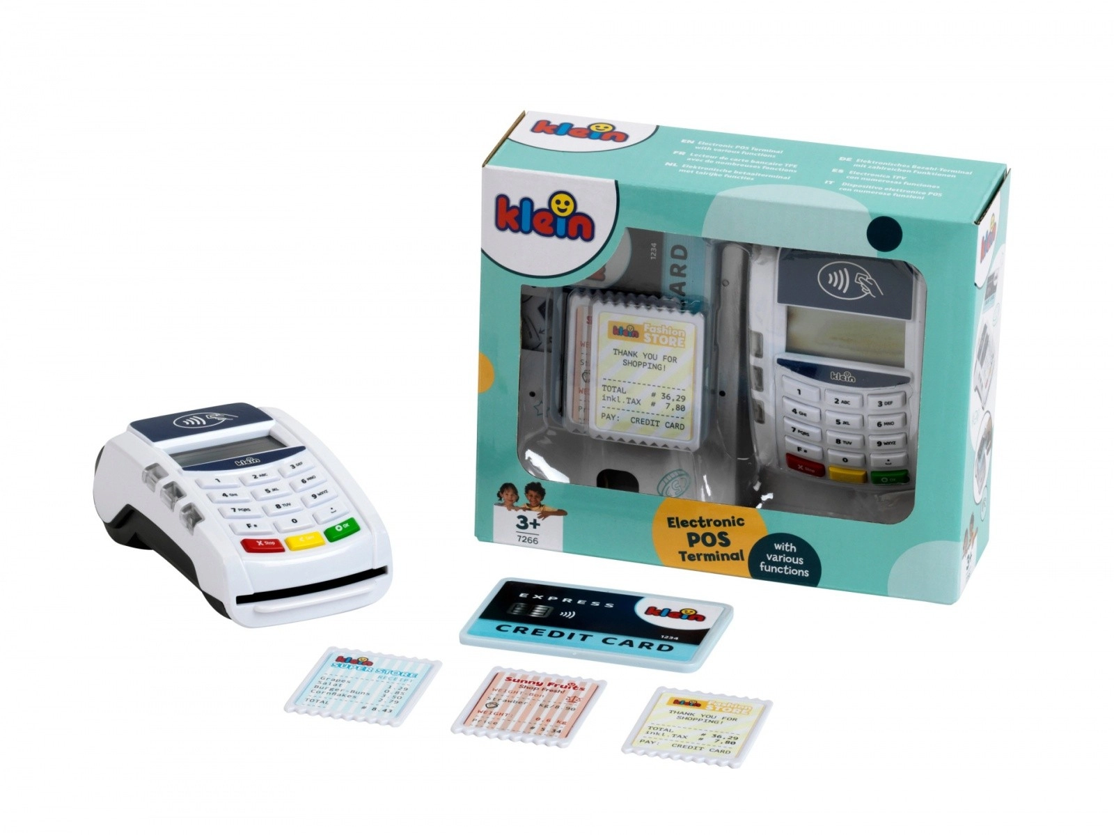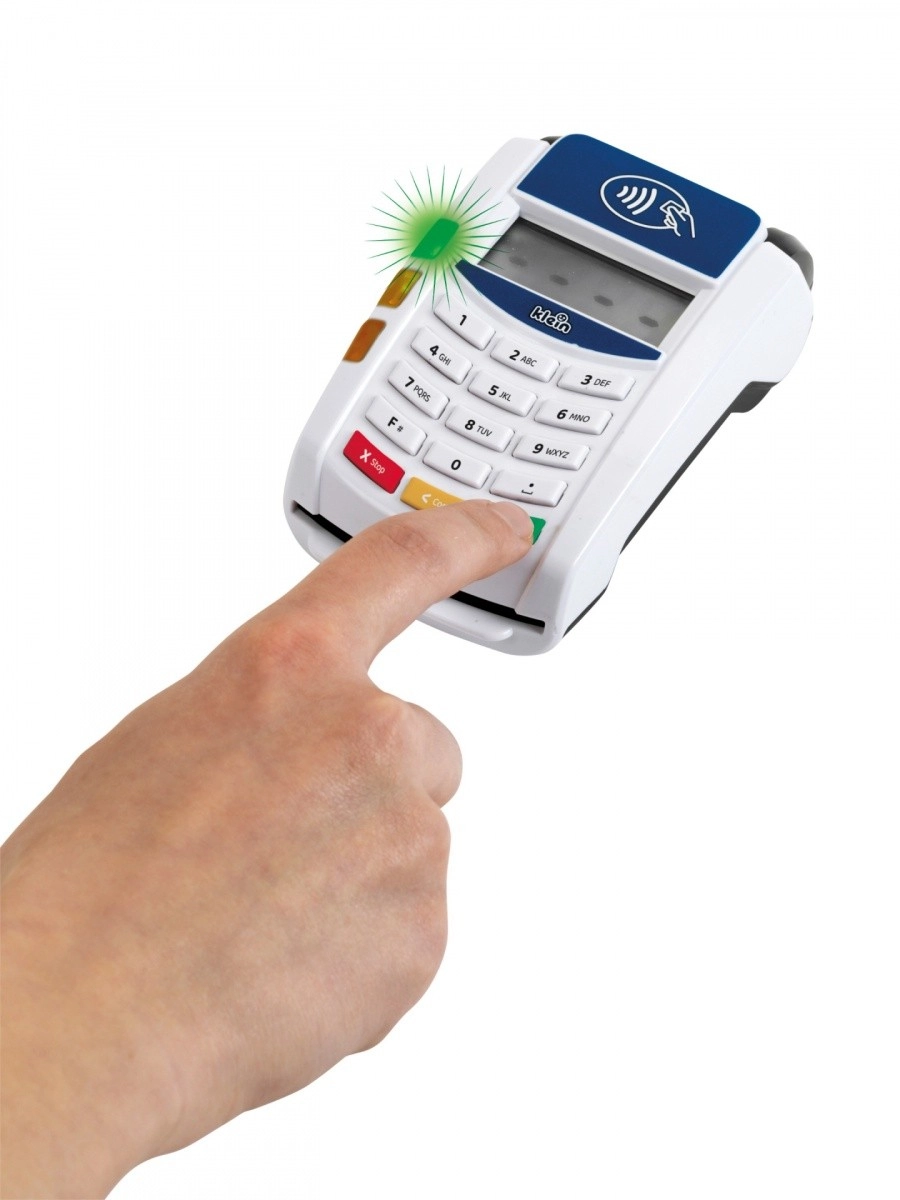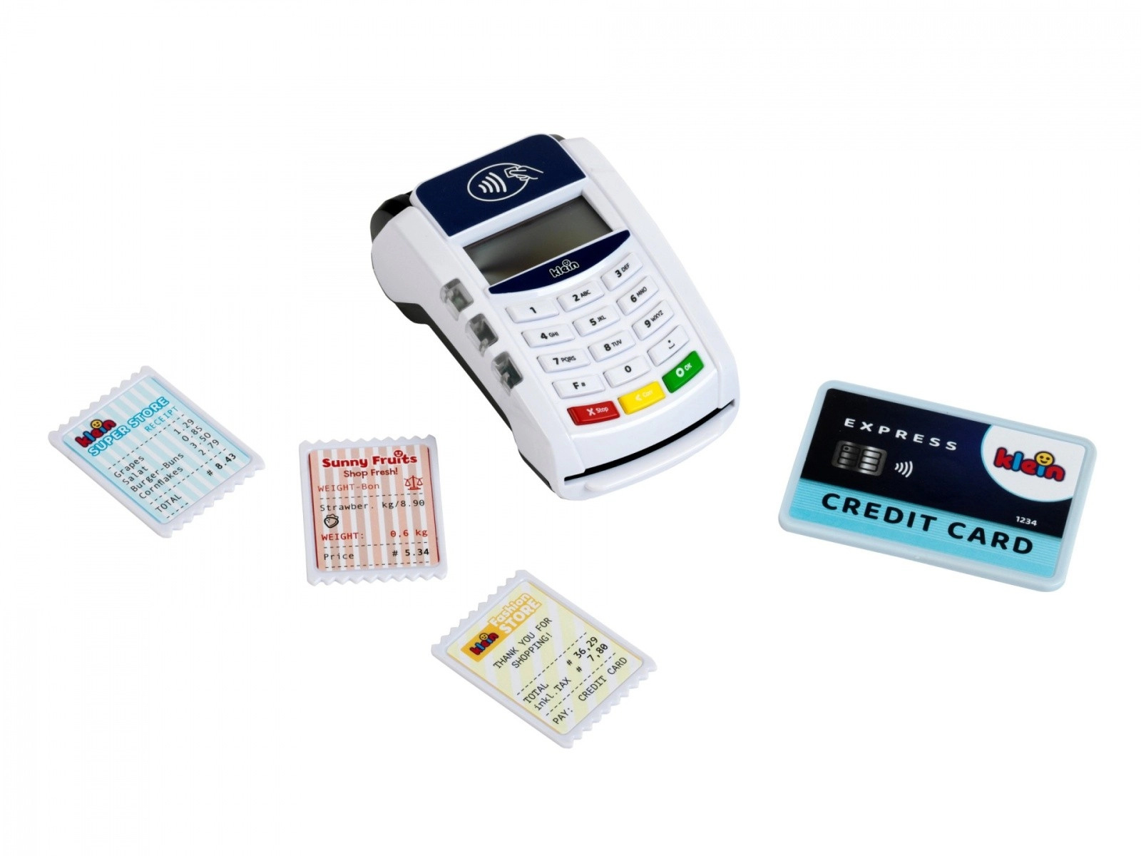 Platni terminal koji je izradila tvrtka Klein dolazi u bijeloj i plavoj boji s bijelim panelom tipkovnice. Igračka je izrađena od kvalitetne plastike i ima mnogo funkcija koje će se svidjeti svakom vlasniku male trgovine. Ovaj dodatak za dječju blagajnu donosi dašak moderne tehnologije u dječju sobu. Beskontaktna plaćanja ovdje postaju oblik igre, ali i oblik obrazovne stvarnosti.