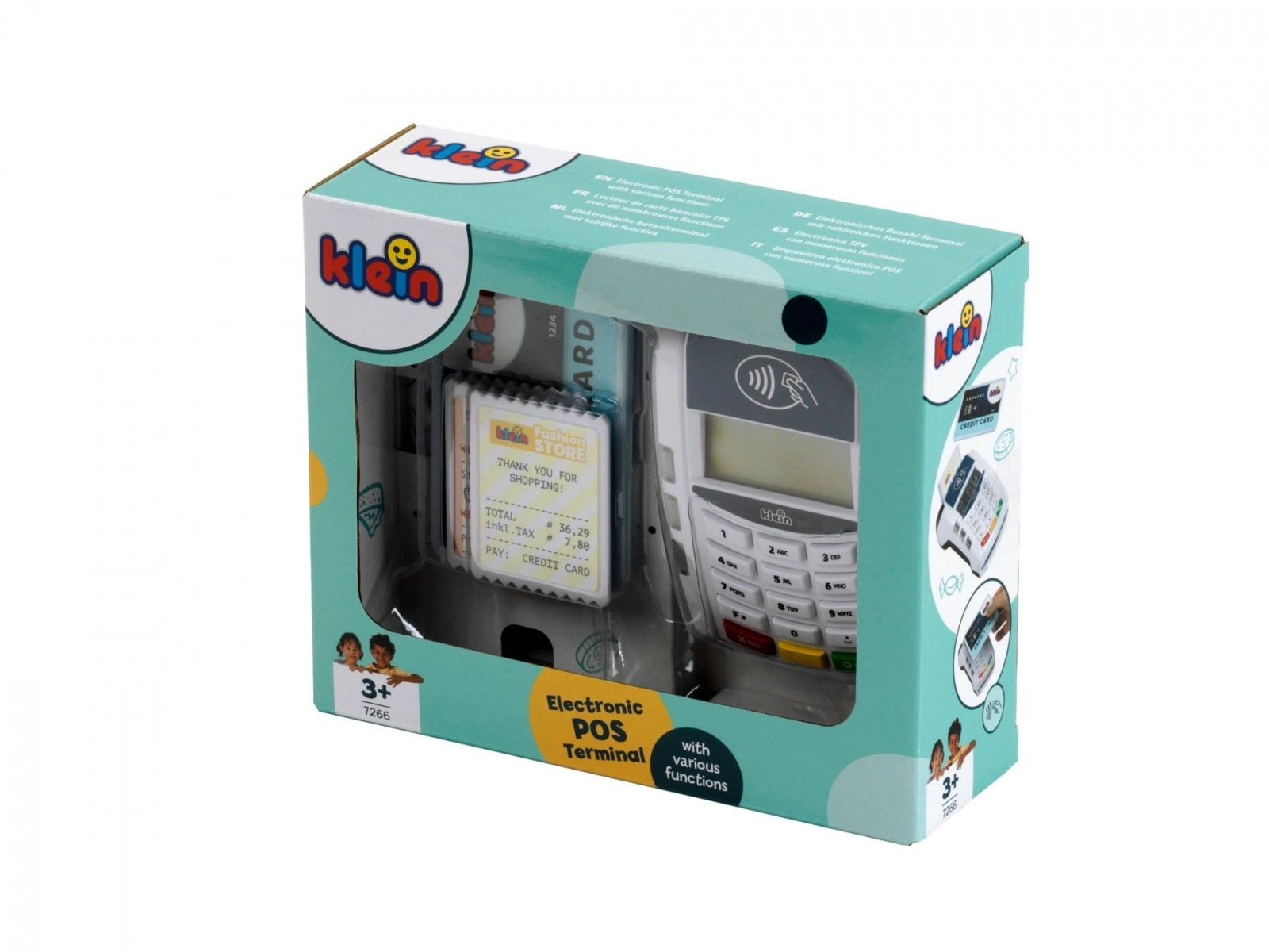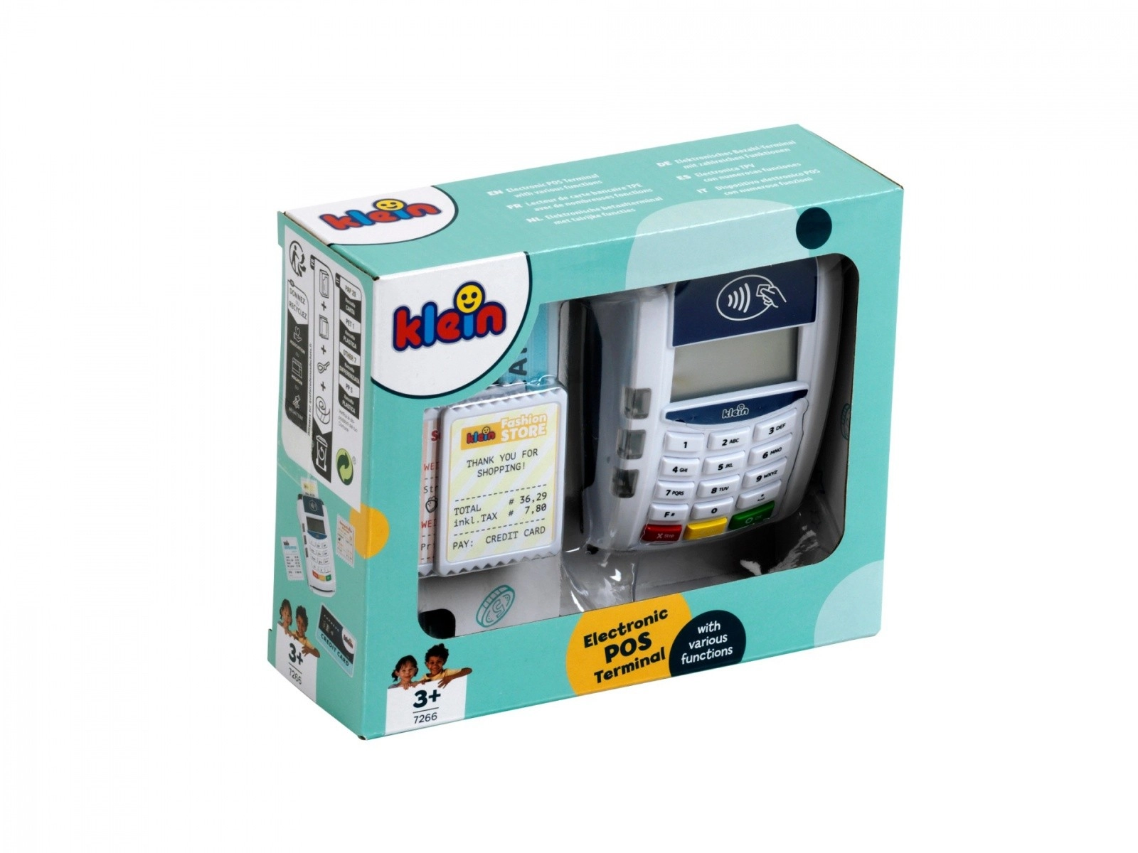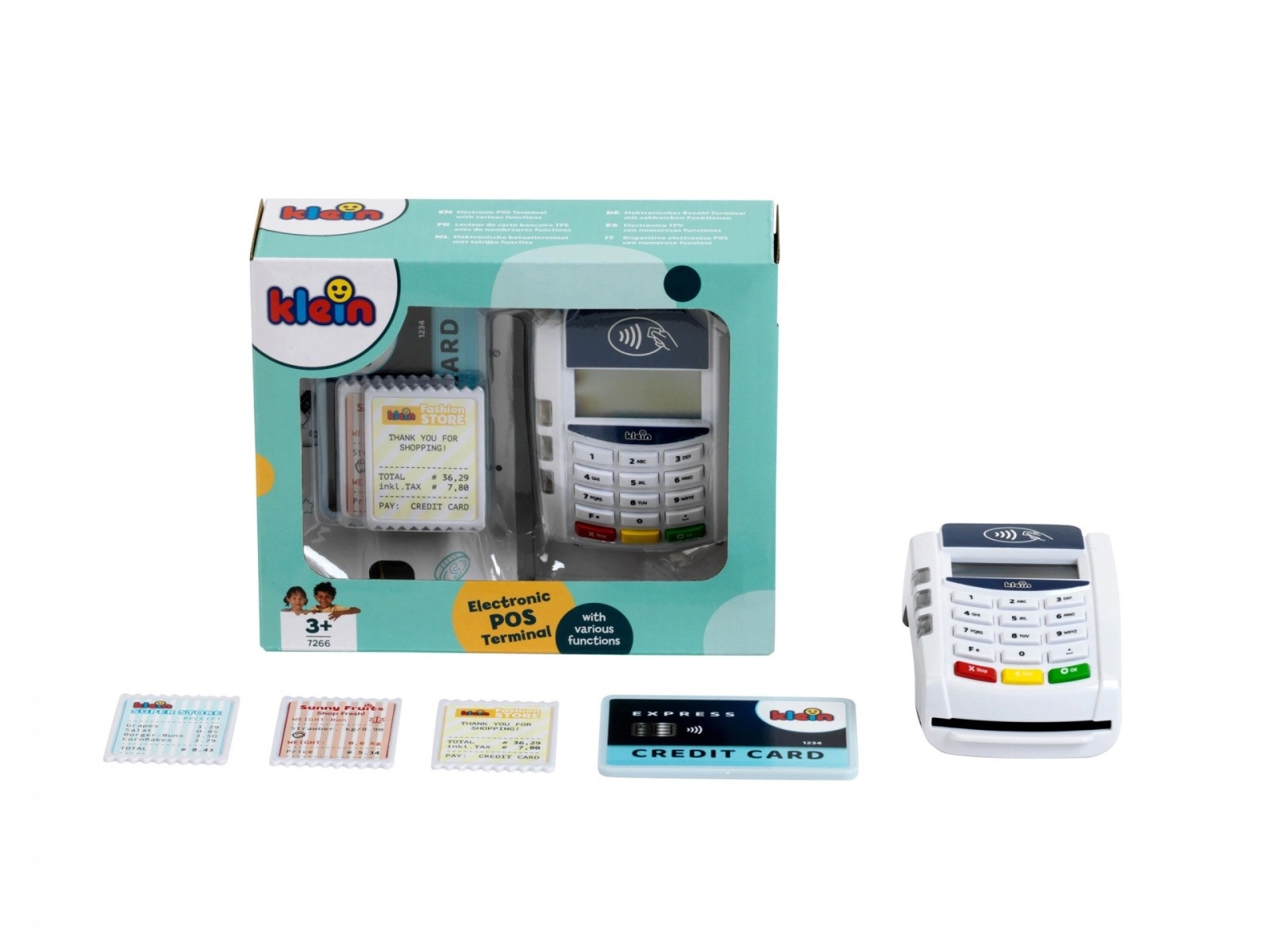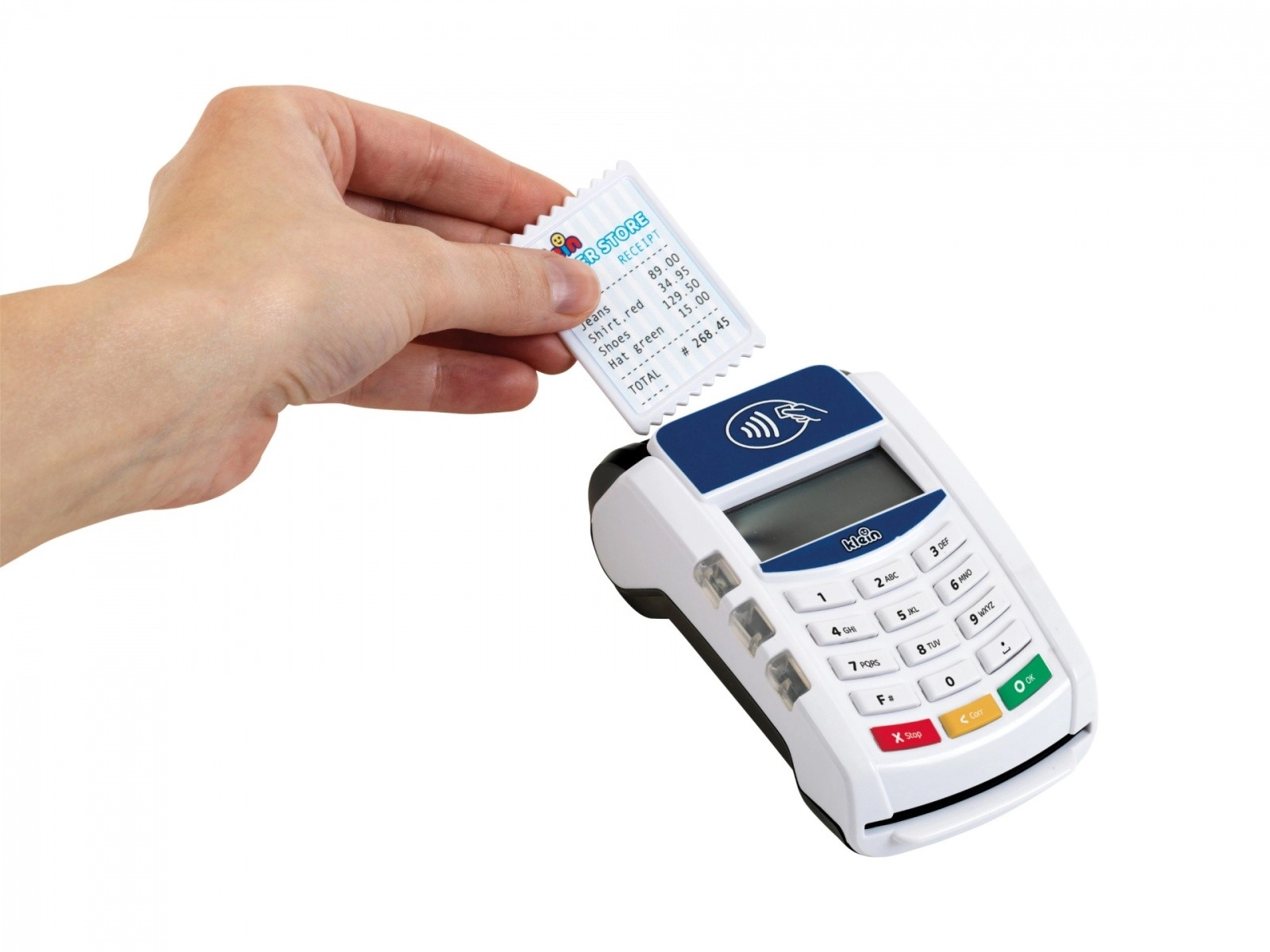 Platni terminal koji je izradila tvrtka Klein dolazi u bijeloj i plavoj boji s bijelim panelom tipkovnice. Igračka je izrađena od kvalitetne plastike i ima mnogo funkcija koje će se svidjeti svakom vlasniku male trgovine. Ovaj dodatak za dječju blagajnu donosi dašak moderne tehnologije u dječju sobu. Beskontaktna plaćanja ovdje postaju oblik igre, ali i oblik obrazovne stvarnosti.