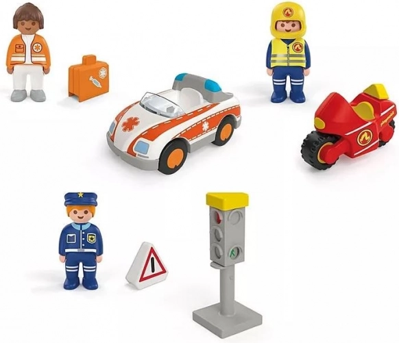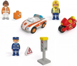 Ovaj razigrani set za male istraživače donosi svijet spasilaca izravno u dječju sobu. Djeca uživaju u realističnim scenama s liječnicom, policajcem i vatrogascem na motoru, dok uče prometna pravila zahvaljujući funkcionalnom semaforu s promjenom svjetala.