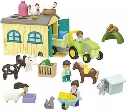 Uz ovaj šareni set djeca stvaraju vlastiti svijet na farmi – od utovara bala sijena, preko hranjenja životinja do jahanja konjića. Interaktivni elementi, poput ploče za razvrstavanje na krovu prema bojama i oblicima, podržavaju učenje kroz igru i zabavno ponavljanje.