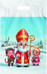 Praktična plastična poklon-vrećica s motivo m Svetog Nikole i izrezom za nošenje. Zahvaljujući čvrstoj plastici otporna je na kidanje i vlagu, idealna za nikolinske poklone, slatkiše i igračke. Dimenzija 29×46 cm pogodna je i za veće predmete.