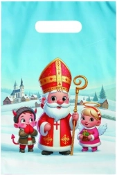 Praktična plastična vrećica s motivuom svetog Nikole u boji dimenzija 20 × 30 cm idealna je za pakiranje darova i slatkiša. Zahvaljujući izrezu za nošenje ugodno se nosi, čvrsta plastika je otporna na kidanje i vlagu, a tisak sa svetim Nikolom, anđelom i vragom stvara blagdansku atmosferu.