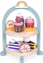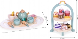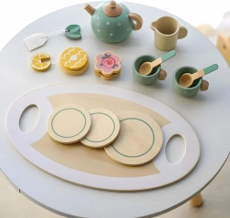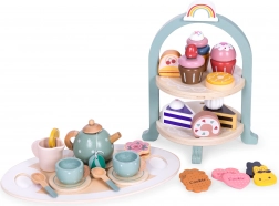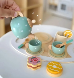 Ovaj sjajan set uvodi djecu u svijet odraslih, gdje će uživati u fantastičnoj zabavi sa svojom obitelji. Sadrži sve potrebno za organiziranje posebnog poslijepodneva: vrč, šalice, tanjuriće i praktičan poslužavnik. Nijedna čajanka nije potpuna bez slastica, stoga set uključuje šarene kekse, kolačiće i muffine, koji oduševljavaju svojim realističnim izgledom. Zahvaljujući ovim igračkama dijete može igrati ulogu odrasle osobe i pozvati vas na ukusan čaj i slatke užine. Osim sjajne zabave, vaše dijete razvija maštu i manualne vještine, a također uči kako pripremiti ukusan čaj ili kavu te usvaja pravila pristojnog blagovanja.