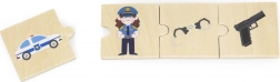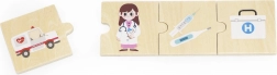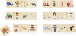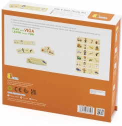 Edukativni set VIGA donosi 24 drvena dijela s prekrasnim ilustracijama, zahvaljujući kojima se djeca kroz igru upoznaju sa 6 zanimanja – primjerice vatrogasac, liječnik, policajac, poljoprivrednik, građevinar ili pekar – i pridružuju im odgovarajuće alate i vozila. Šarene sličice potiču učenje novih riječi i proširuju rječnik.