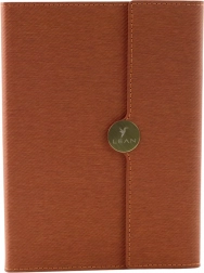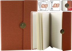Teksturirana korica s preklopom i kružnim metalnim elementom djeluje profesionalno i otporna je na trošenje.