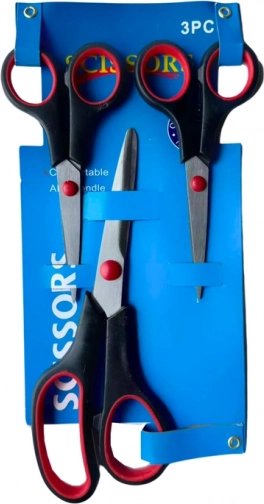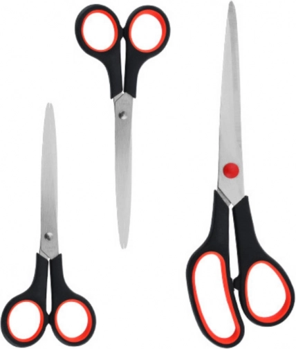 Praktičan set triju univerzalnih uredskih škara za svakodnevnu upotrebu u kućanstvu, uredu i radionici. Sadrži veličine 20 cm, 14 cm i 12,5 cm za različite zadatke. Oštre oštrice od nehrđajućeg čelika osiguravaju glatko i precizno rezanje, a ergonomske plastične drške pružaju udoban hvat i pri duljem radu. Set je otporan na koroziju i ima certifikaciju CE.