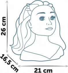 Češljajuća glava za stvaranje trendi frizura. S magičnom funkcijom: upotrijebi priloženi kist za usne namočen u hladnu vodu i usne će se lijepo obojiti. Sadrži 19 komada dodataka koje možeš pohraniti u tajnom skrovištu u postolju glave. Opremljeno vakuumskim čašicama na donjem dijelu postolja za bolju stabilnost. Visina glave 26 cm.