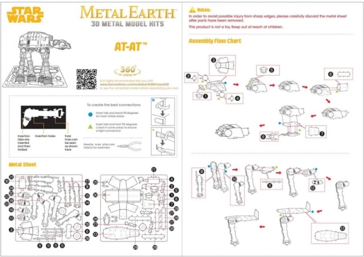 Set sadrži 2 čelične pločice s prethodno izrezanim dijelovima i jasan priručnik. Dijelovi se spajaju pomoću malih zasuna i savijanjem „kukica“. Za ugodniji rad preporučujemo kliještice za rezanje i fine ravne kliješta (nisu uključene). Preporučena dob je 14+, gotov model mjeri približno 6,2 × 5,8 × 5,2 cm.