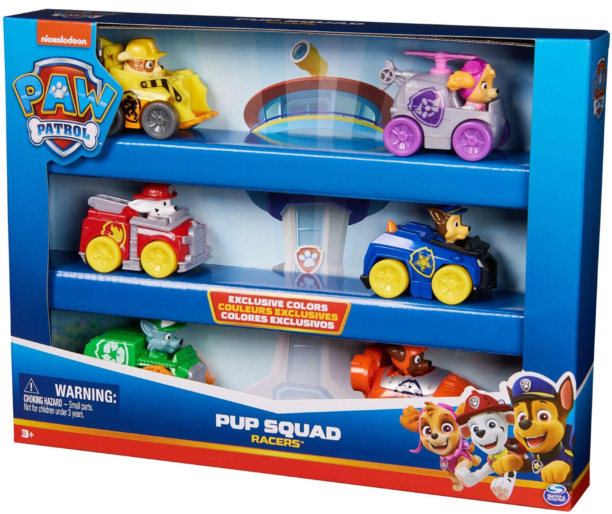 Set Pup Squad Racers donosi šest detaljno izrađenih vozila s čvrsto pričvršćenim figuricama junaka PAW Patrol – Chase, Marshall, Skye, Rocky, Rubble i Zuma. Autići su izrađeni od izdržljive plastike, imaju pogon guranjem i zahvaljujući malim dimenzijama lako se upravljaju i prenose.