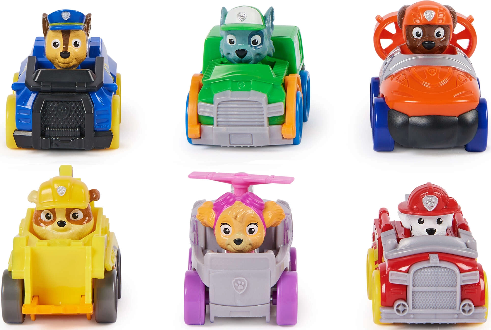 Chase, Marshall, Skye, Rocky, Rubble i Zuma u mini vozilima spremnima za svaku misiju. Idealno za skupljanje i zajedničku igru.