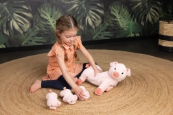 Set plišanih igračaka Prasići s Mamom nudi vrlo mekani i ugodni materijal, koji je idealan za maženje i igru. Mama ima na trbuhu praktičan patentni zatvarač, kojim se mogu otkriti mala prasad sakrivena unutra, što je sjajno za razvoj emocija i osjećaja brige kod djece. Ova funkcija je također praktična za putovanja, jer se mladunci mogu sigurno sakriti.